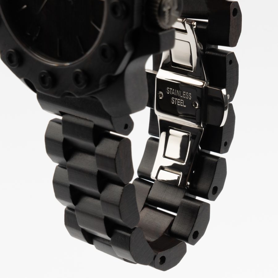 A men's wristwatch with a bold design that reflects strength and sophistication at the same time. The dial is made of the finest dark wood, giving it depth and quiet elegance. It is surrounded by a sturdy frame with metal details that add a strong and striking presence, with a black metal bracelet that enhances the modern and luxurious character, for the man who prefers unconventional elegance and is looking for a watch that expresses his strong personality in a sophisticated and distinctive style.