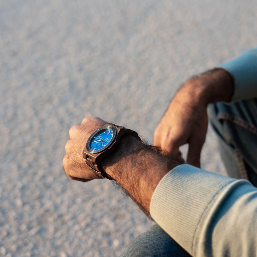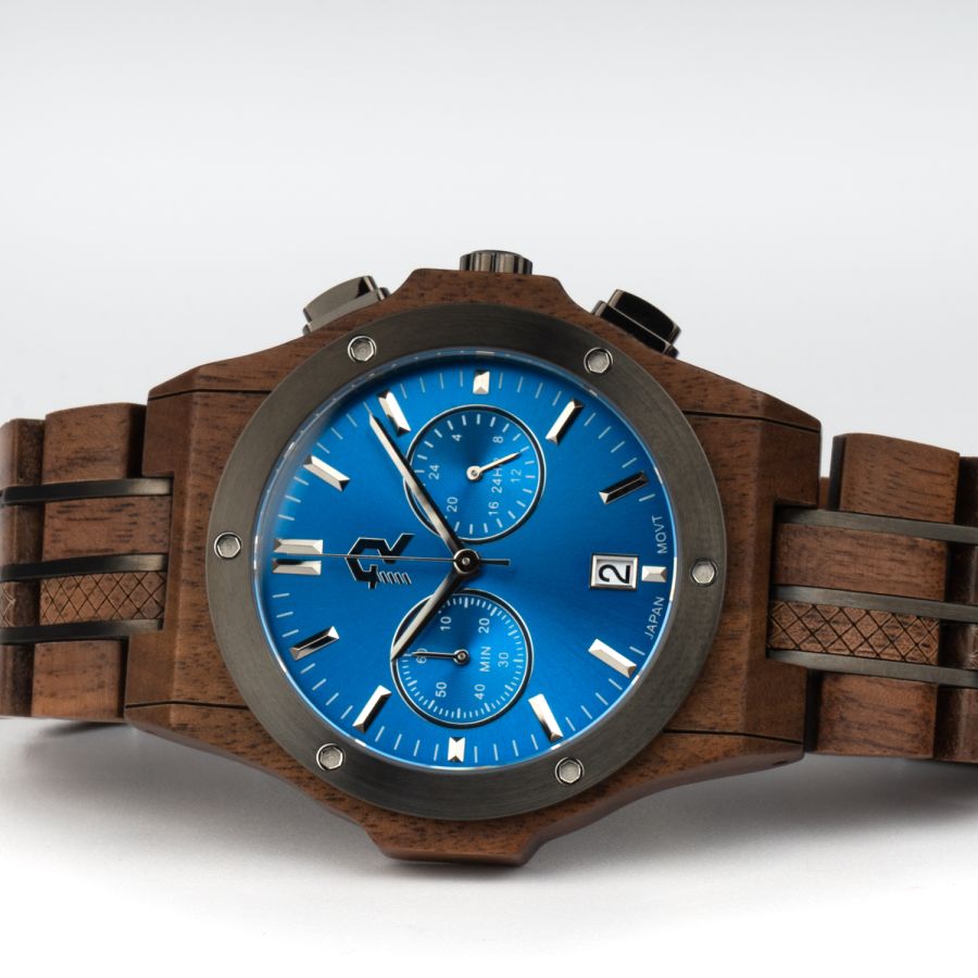 A men's wristwatch with a design that blends luxury and boldness, where polished natural wood meets a vibrant blue dial, reflecting striking depth and elegance. With a robust case featuring delicate metal details and chronograph counters that add a touch of practicality and sportiness, it's the perfect choice for the man who appreciates authenticity and seeks an exceptional piece that complements his presence with confidence and sophistication.